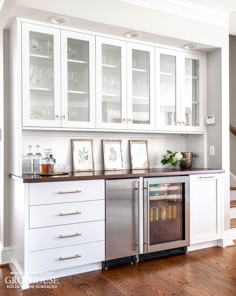 Notes: This Peruvian Walnut Wet Bar Countertop creates the perfect surface to fix up your favorite drink, while aesthetically complementing the wood floors and bright white cabinets.