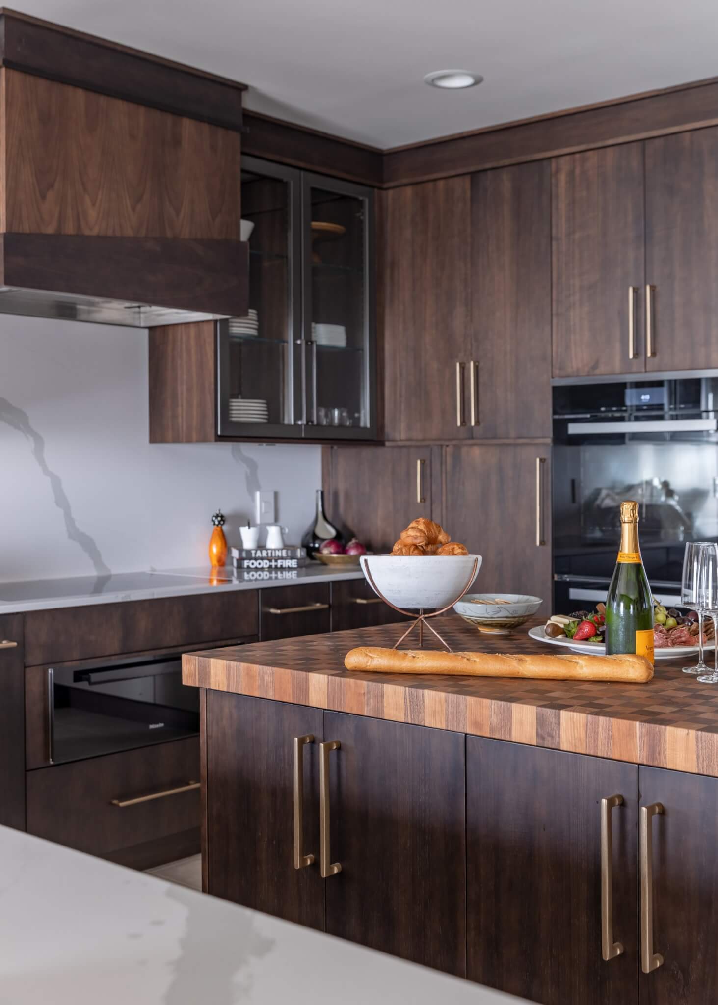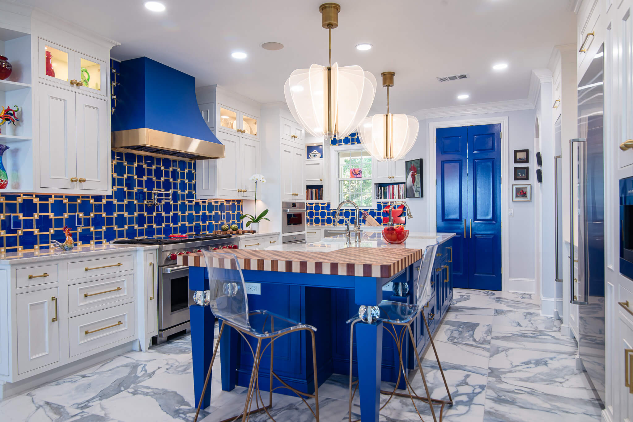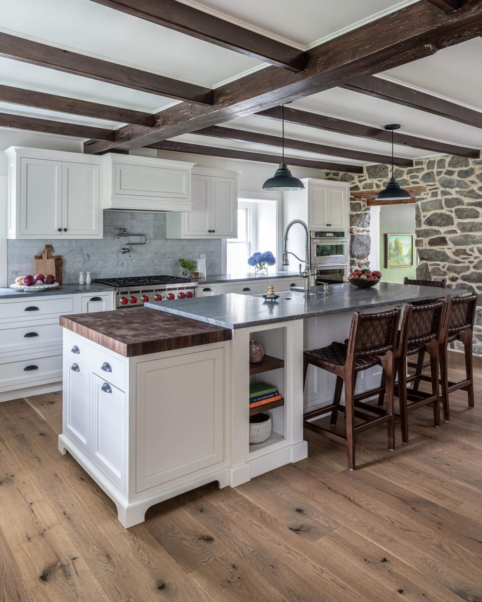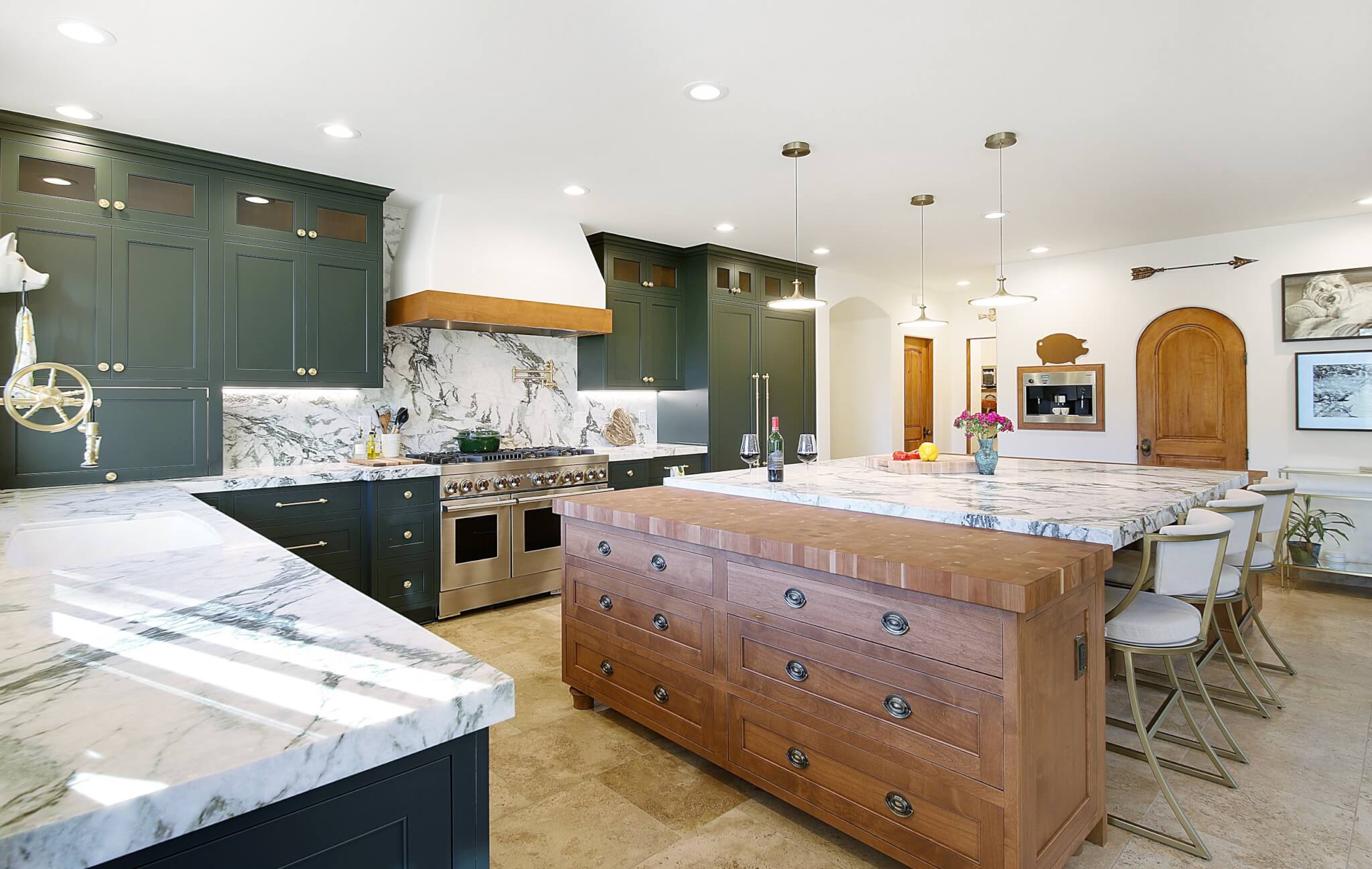 The butcher block countertops shown in this gallery are end-grain construction. This style of butcher block can be crafted from over 60 species. Many of the butcher block countertops shown are used for direct chopping and food preparation. A butcher block island can contain a sink, as we specially treat the opening with our proprietary sealants to ensure worry free use around water. Butcher Block countertops are safe to use around stoves when properly installed. These organic surfaces ship in two to three weeks (14 to 21 days) and arrive with a comprehensive lifetime warranty. Click on each thumbnail image below to launch a full size version of the image and learn more about the interior design of the space.