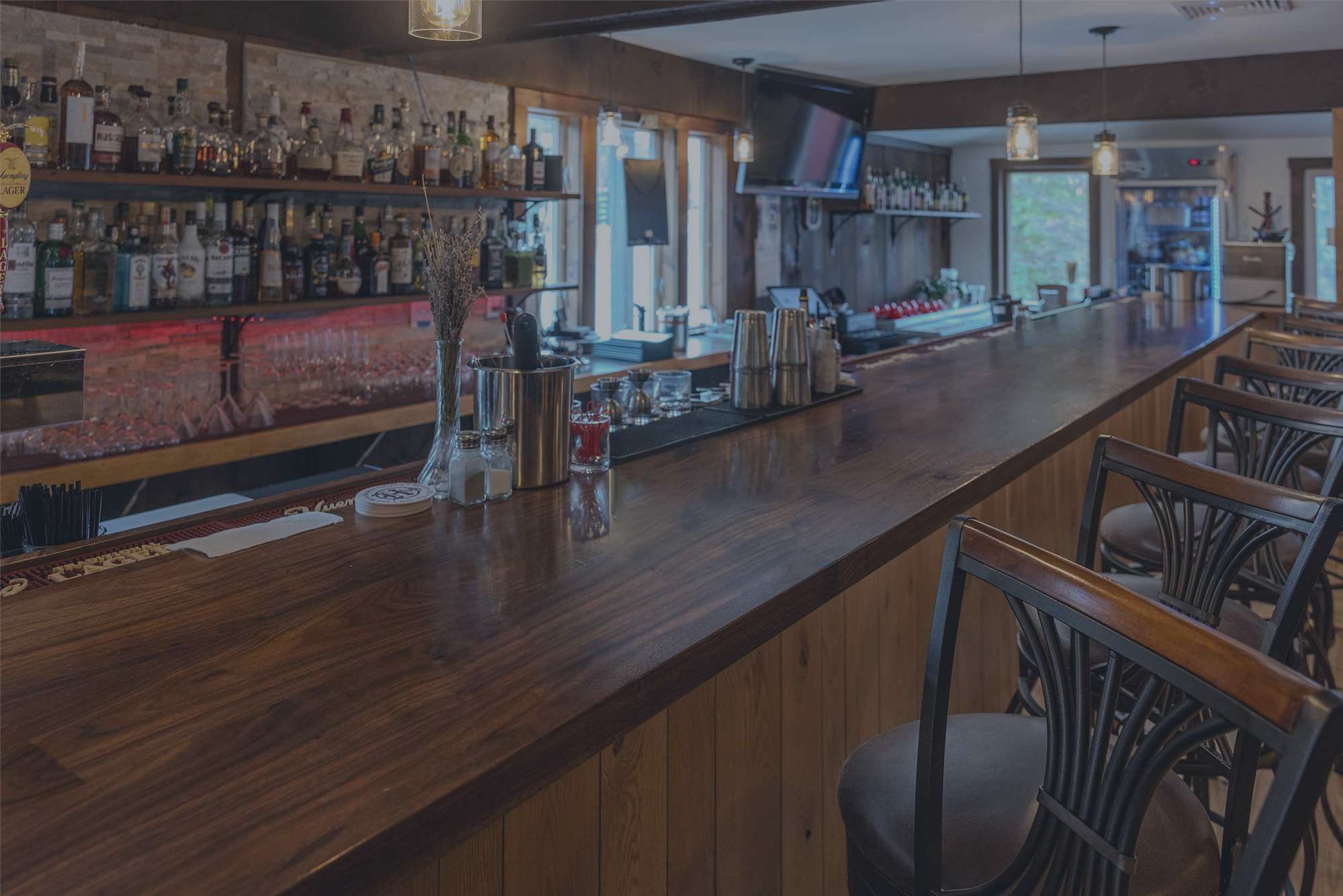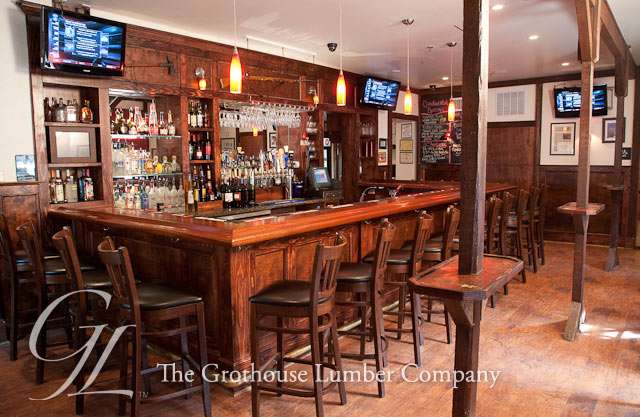 Grothouse fabricates custom wood bar tops of solid wood with no veneers. Our exclusive Durata® finish is the most durable finish on the market and is used on commercial bar tops and home bar tops alike. Durata® shields the wood, exceeding the protection of epoxy bar tops with a thinner, flexible, and more natural-looking surface. The flexible nature of Durata® permits a lifetime of use without the finish flaking and peeling that can occur with traditional varnishes or polyurethanes. The gallery below provides design inspiration for your home or commercial bar. By adding classic Chicago rail, the patron is protected from spilled drinks, and the curved ergonomic rail provides a comfortable resting place for elbows and arms. Our Chicago rail is crafted in-house using the same lumber as the bar surface to ensure an organic match. Each custom wood bar top can be manufactured of any wood species we offer and are shipped in two to three weeks (14 to 21 days).