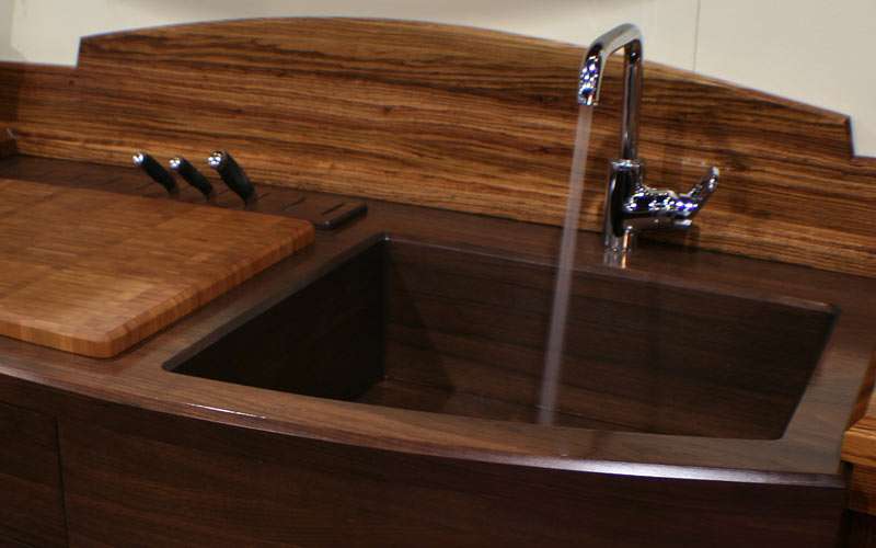 Knife slots can be configured as a single straight line. This permits any knife of any size to be placed in the slot. Designing wood countertops with knife slots of fixed sizes can present a problem if you change your knife set. Grothouse has developed removable knife slots to solve this problem. Removable knife slots can be replaced with another piece when your knife set changes. Clients are thrilled with the idea. Each removable knife slot can be designed to any shape or size desired. The photo to right shows a curved removable knife slot made of Teak. There are six slots for knives and a center hole for the knife sharpener.